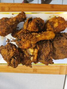 - Wash chicken in vinegar and water, rinse and drain properly. In a bowl add 1 tsp of all the dry seasoning and mix well to combine, season chicken well making sure to get under the skin. Cover and marinade at least 1 hour. In a bowl add all purpose flour, corn starch, rice flour, baking powder, baking soda and mix well to incorporate, add ½ tsp of the remaining dry mix and again mix well to incorporate. Cover chicken pieces well into flour mixture and set aside on a rack. Preheat Air Fryer on 375 for 6 minutes to get Air Fryer basket hot so the chicken pieces will not stick. Lay chicken pieces on Air fryer basket the thighs skin side down . Air fry on 375 for 35 minutes, flip then cook for another 25 minutes.