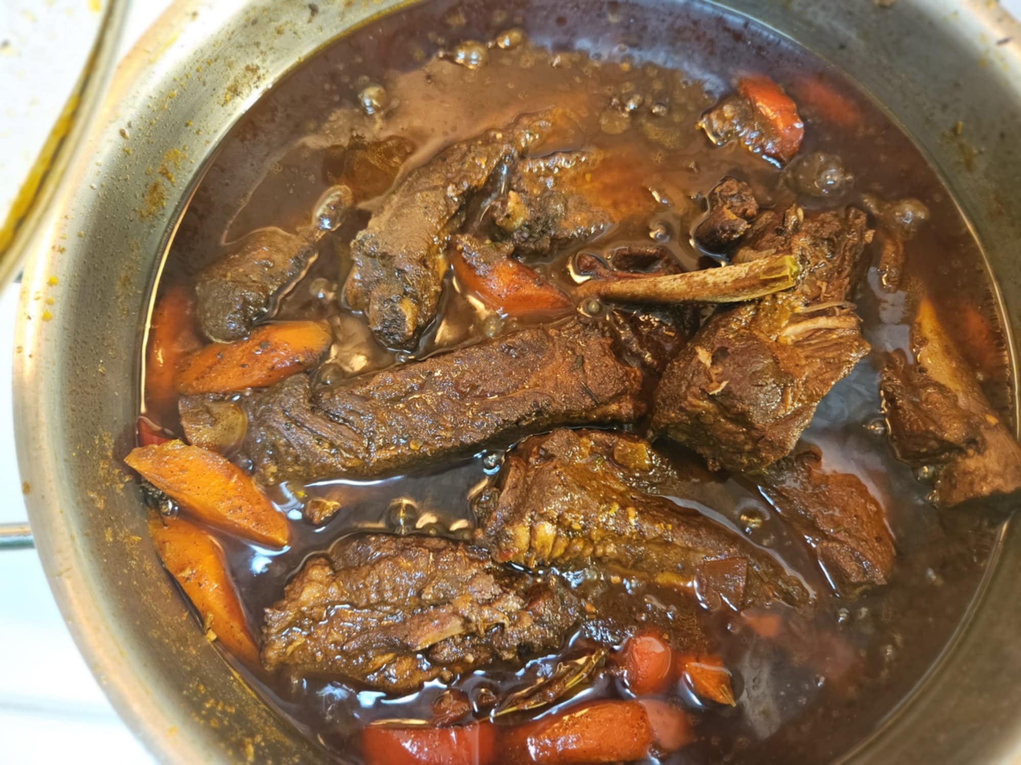 2. Heat oil on medium heat and brown each ribs 3 minutes on each side. Add the ribs back to the pot, add the minced garlic and minced scotch bonnet if you use, and stir well to combine. Add 3 cups of water, cover and cook for 1 hour and 30 minutes. Add onions, bell peppers, tomatoes, and fresh thyme, stir well to combine. Add remaining 1 cup of water, stir well to combine, add ketchup and stir well to combine, cover and cook 30 minutes, then add ketchup, stir well to combine, cover and cook additional 15 minutes.