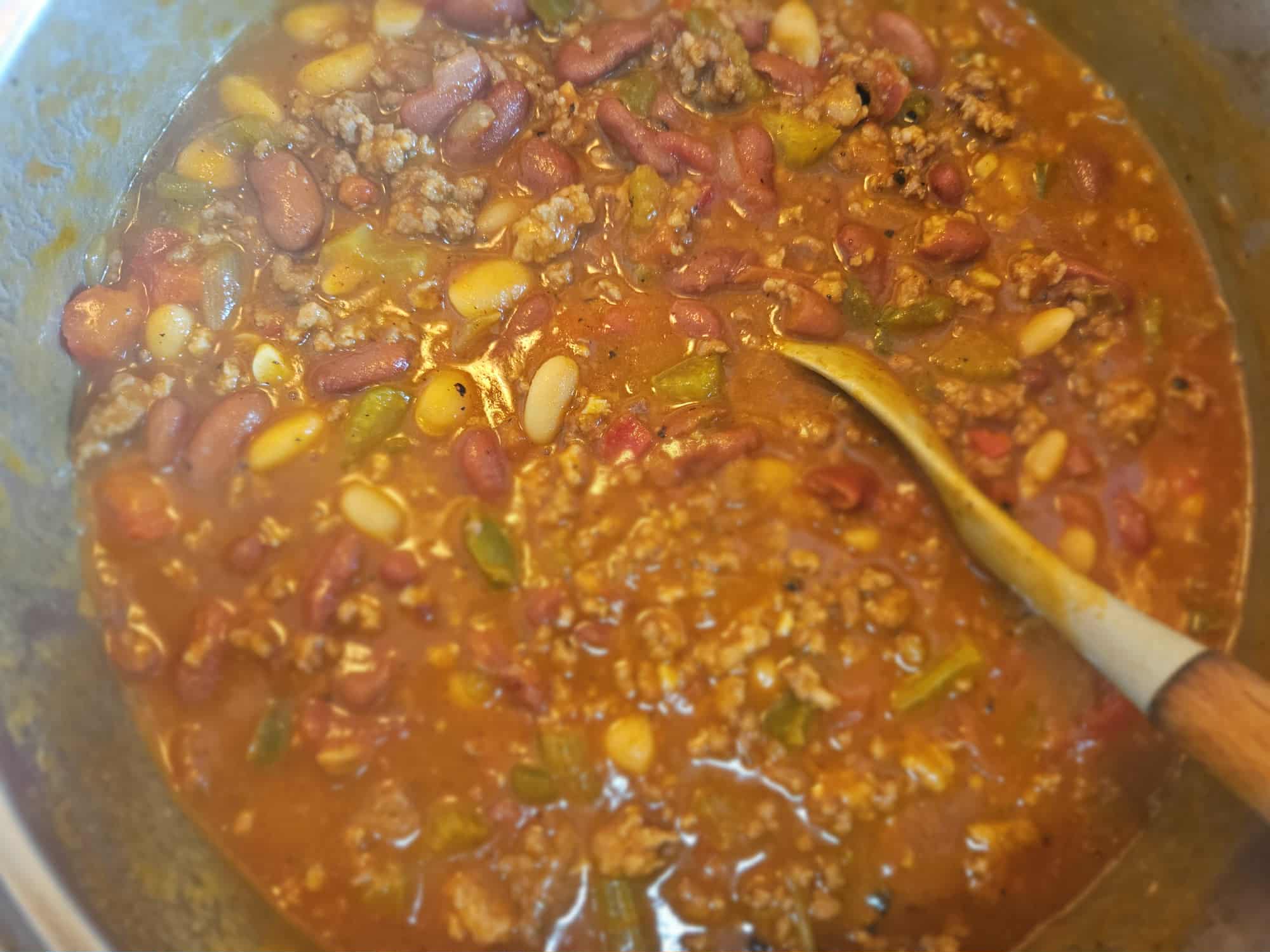 - Heat avocado oil on medium low heat, add onions bell peppers and celery, add ½ tsp salt, stir combine cook for 2 minutes stir constantly, add garlic and cook for 1 minute stirring well to combine, add ½ tsp of other dry seasonings (no more salt )stir well to combine. Add ground beef and stir to combine, add ground pork stir to combine using a masher to not get any lumps, add 1 tsp of dry seasoning mix and ½ tbsp jerk marinade, cook for 6 minutes stirring constantly, remove excess liquid . Add canned tomatoes, tomato sauce , stir well to combine, add both beans and stir well to combine. Add remaining ½ tsp dry seasoning mix, remaining ½ tbsp jerk Marinade and Debbies Caribbean soul spice. Mix well to combine, cover and cook on low for 45 minutes, stirring occasionally.